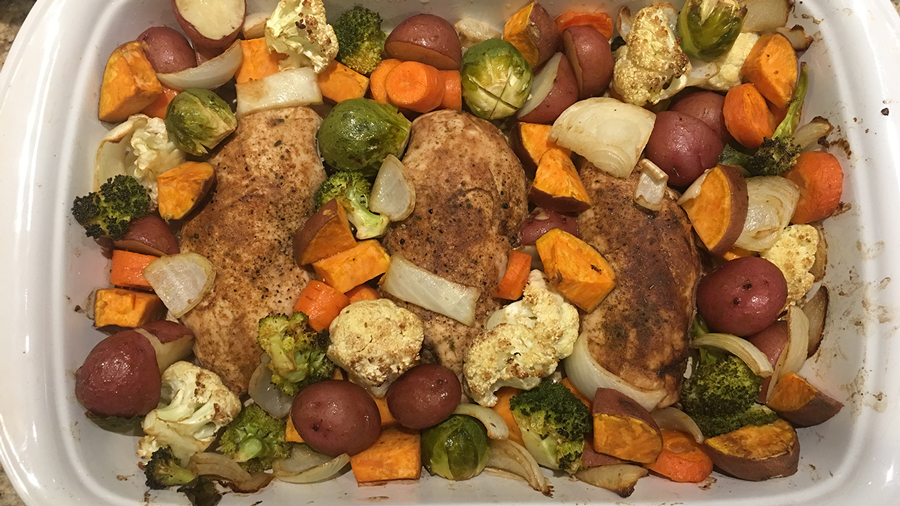 - Place the chicken and vegetables on a baking sheet or in an oven safe dish and place in middle rack of oven for 45-50 minutes.