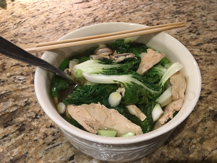 - While broth is heating, and noodles cooking, slice mushrooms, clean bok choy, green onions, and other veggies, wash the sprouts and basil, etc…