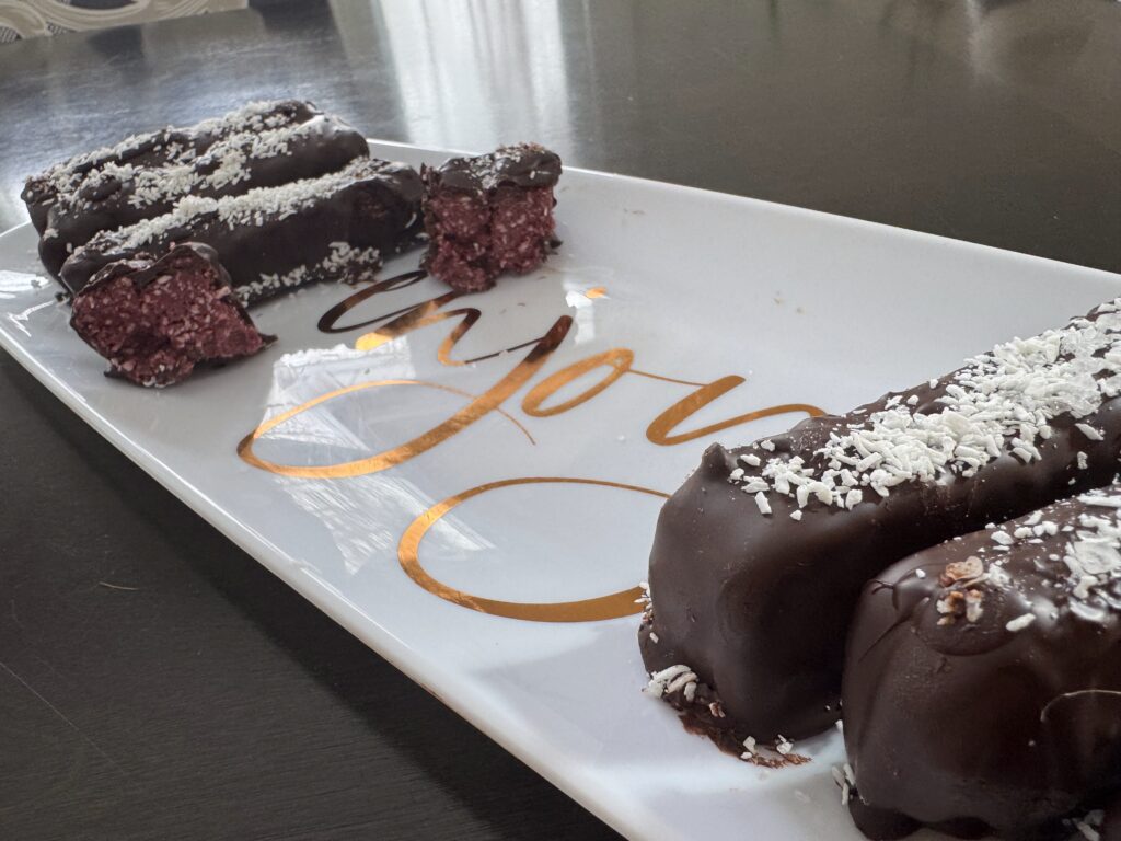 Cut frozen raspberry mixture into bars and dip in to chocolate mixture. Ensure the bars are fully coated in chocolate, then sprinkle shredded coconut over the top