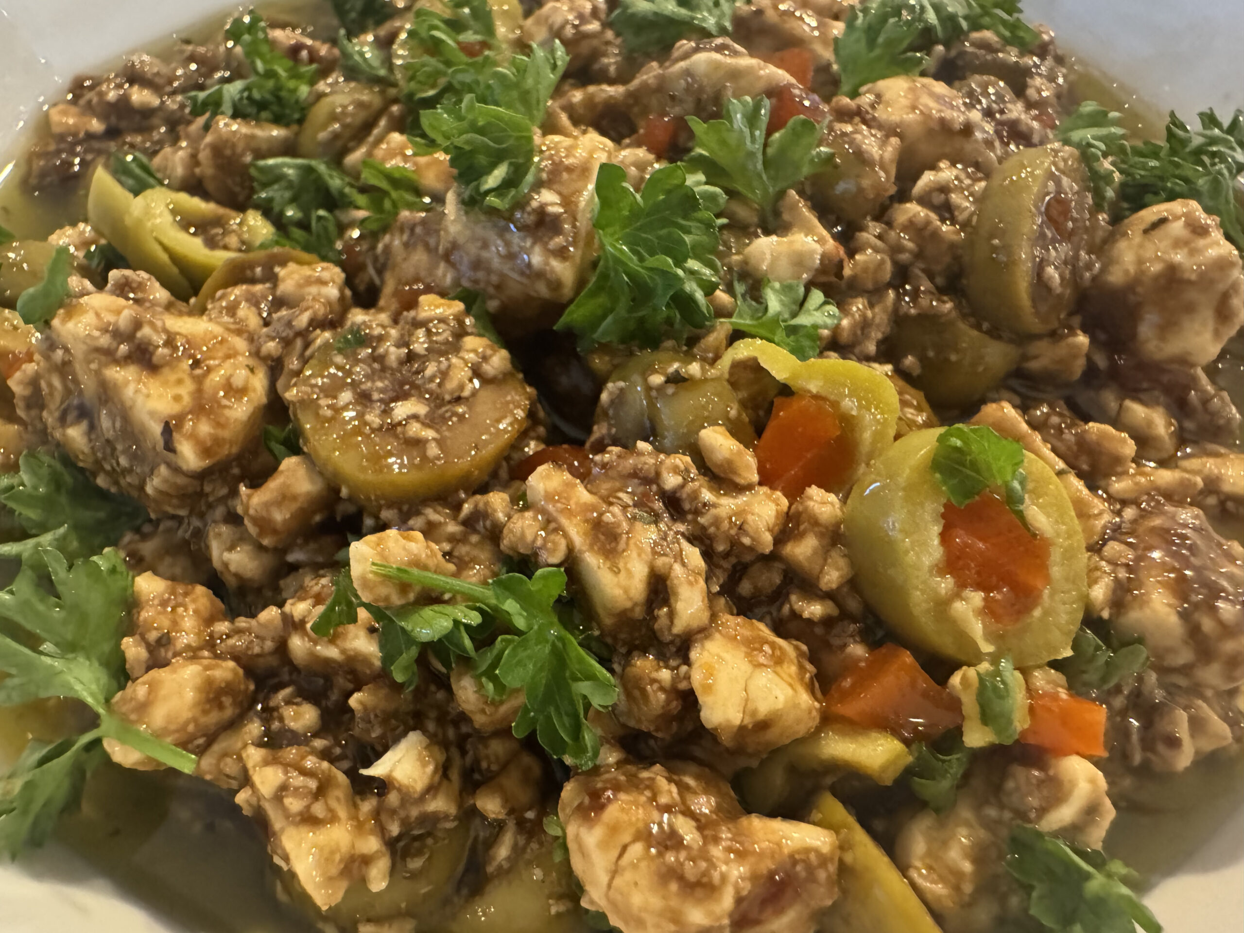 When the sheet pan comes out of the oven, mash up the roasted garlic and add it to the dressing.