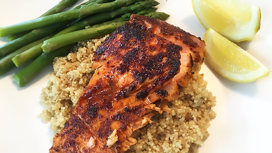 - Pan-sear salmon for 5-7 minutes, flip and fry for an additional 1-2 minutes or until center is flaky. (Cooking times may vary depending on the thickness of each fillet.) Remove from heat and serve with steamed asparagus on a bed of ½ cup of quinoa.